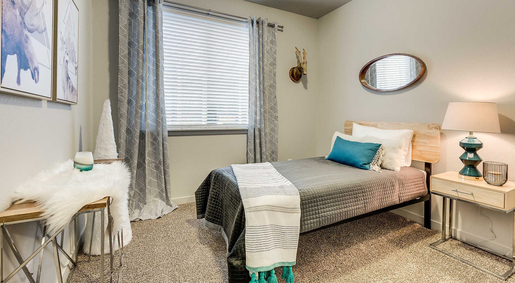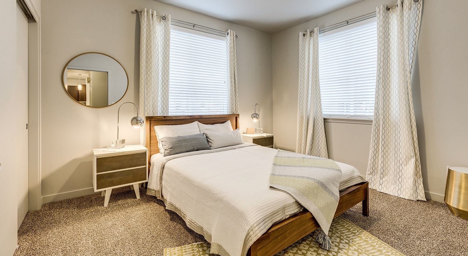 • Spacious and well lit bedroom with plush carpet and large windows
