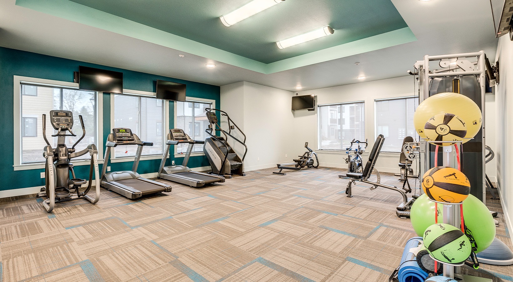 • Large fitness center with cardio and weight lifting equipment.