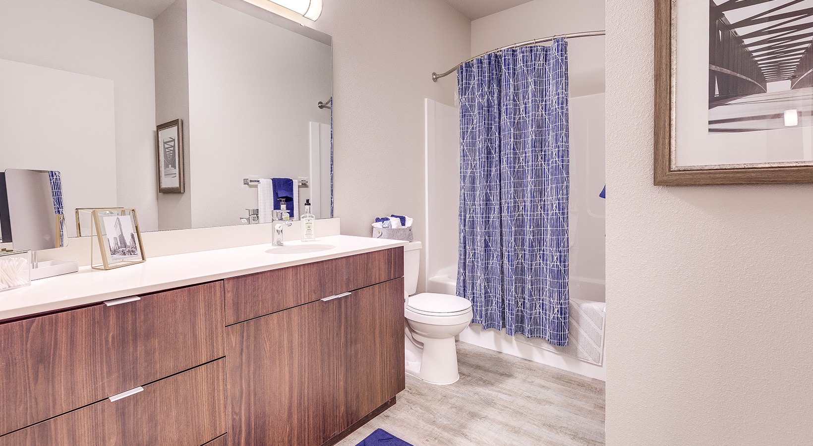 • Large well lit bathroom with large mirror and white cabinets